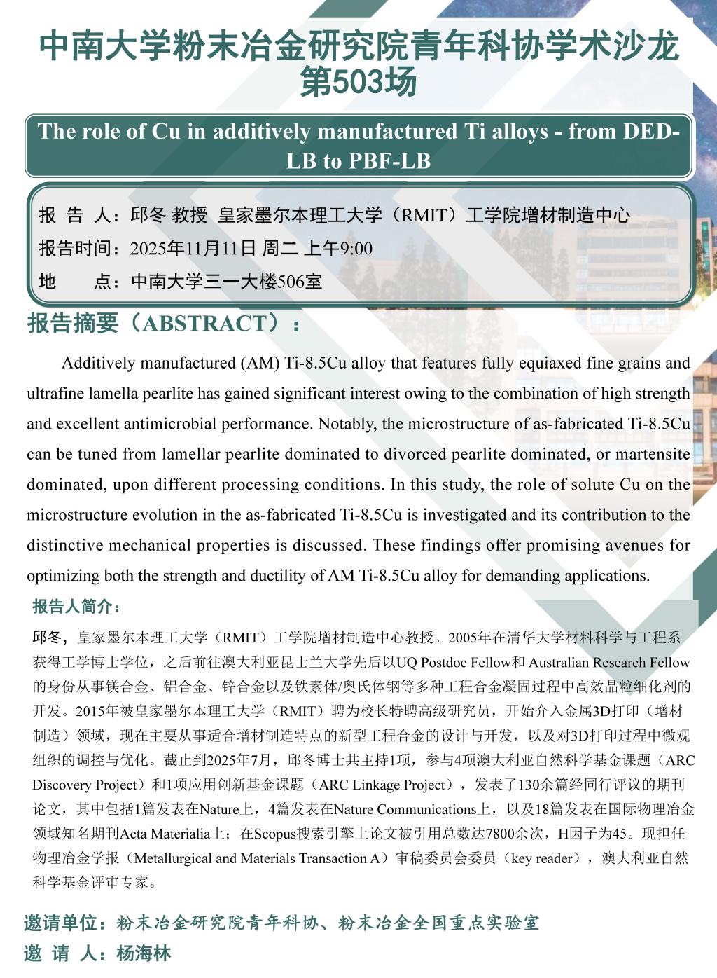 中南大学粉末冶金研究院青年科协学术沙龙 第503场